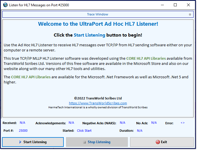 Our UltraPort HL7 Ad Hoc TCP/IP Listener. Yes, that is correct a FREE HL7 TCP/IP Listener! Test receiving HL7 messages over TCP/IP before you install (or pay for) a full HL7 Listener product!